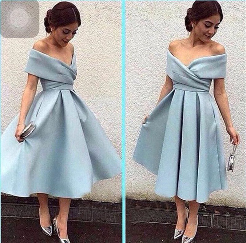 Grosshandel 2019 Einfache Blaue Kurze Abschlussball Kleider Weg Von Schultern Geraffte Satin Tee Langen Abend Kleider Formale Frauen Partei Kleider Preiswerte Kleider Gewohnheit Von Wddingdress Bridal 78 67 Auf De Dhgate Com Dhgate